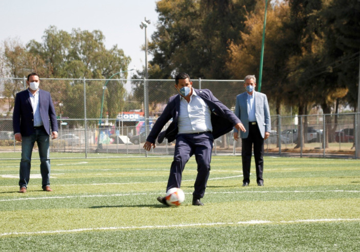 El gobernador, Diego Sinhue Rodríguez Vallejo, entregó dos canchas de futbol y supervisó otras obras como los baños de la alberca y el proyecto de dos campos de futbol soccer de la deportiva Enrique Fernández Martínez.