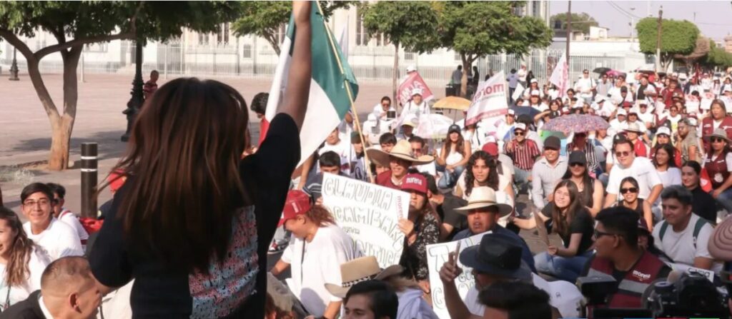 Después marcharon con pancartas y mantas por la calle Madero gritando consignas como “Justicia” “se ve, se siente, los jóvenes con Claudia están presentes”, “es un honor estar con Claudia hoy” hasta llegar a la plaza principal de esta ciudad.
