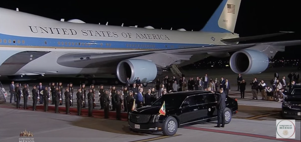 CDMX 9 enero 2023.- El presidente de Estados Unidos Joe Biden, aterrizó ayer aproximadamente las 19:00 horas en el Aeropuerto Internacional Felipe Ángeles (AIFA) en la Ciudad de México, a bordo del Air Force 1, donde fue recibido por el presidente de México Andrés Manuel López Obrador, luego de visitar la frontera compartida entre ambas naciones, para participar en la Cumbre de líderes de Norteamérica.