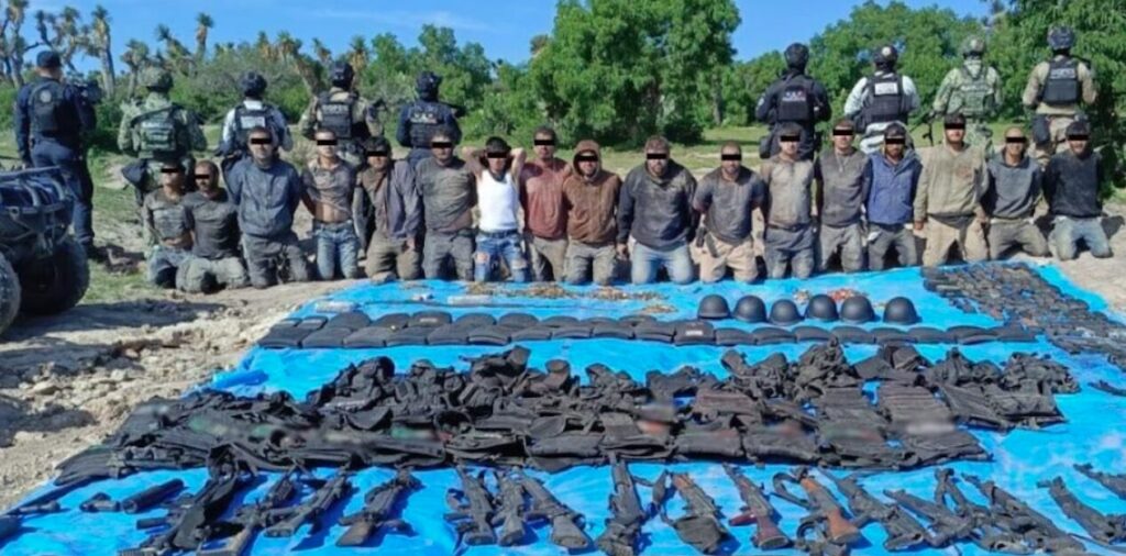 Mediante un comunicado, el Gabinete de Seguridad detalló que como resultado del operativo contra un campamento del crimen organizado en Aguascalientes se logró el arresto de 18 personas, así como el aseguramiento de 20 armas de fuego, un aditamento lanzagranadas, 28 chalecos tácticos, cascos, cargadores, cartuchos y fornituras, además de un kilo de polvo blanco.