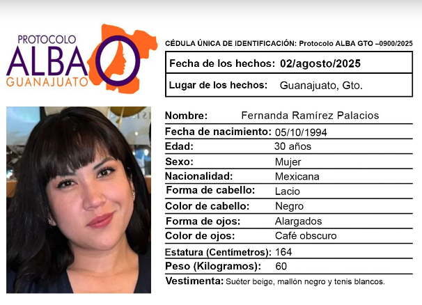 Guanajuato, Gto.- Luego de varios días de búsqueda, este sábado 9 de agosto Fernanda, de 30 años de edad, fue localizada sana y salva en el municipio de Lagos de Moreno en el estado de Jalisco.