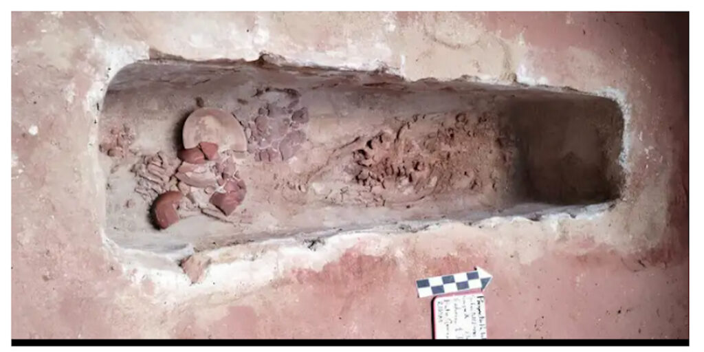 “La tumba se encuentra a cuatro metros de profundidad en la cima de la estructura, se trata de lo que se conoce como una cista, espacios funerario construido con sillares de piedra a manera de cajón y cuyo techo es sellado o tapado mediante lajas de piedra caliza.