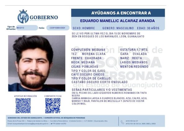 León, Gto. (24 noviembre 2024).- Tras una semana de ser reportado como desaparecido fue localizado sin vida el comentarista deportivo Eduardo Manellic Alcaraz Hernández.