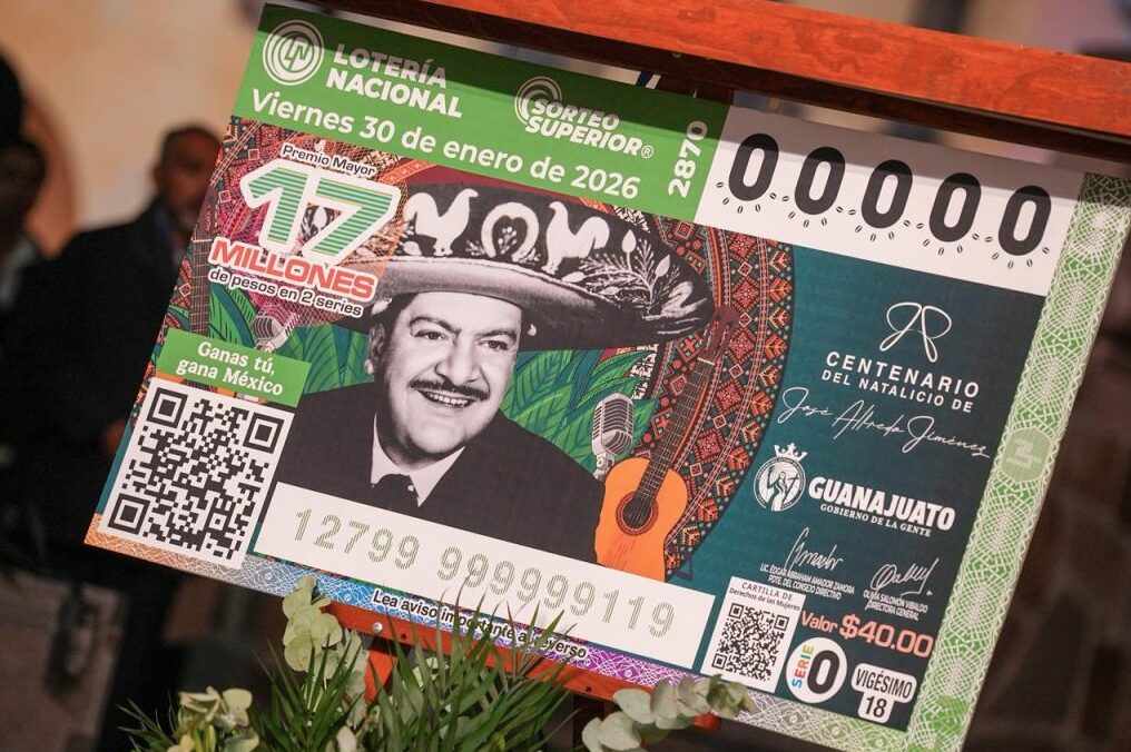 Dolores Hidalgo, C.I.N., Gto. 30 de enero de 2026.- En el marco del Sorteo Superior No. 2870 y desde Dolores Hidalgo, Guanajuato, la Lotería Nacional realizó su primer sorteo en territorio de 2026, para celebrar el Centenario del Natalicio de José Alfredo Jiménez, cantautor mexicano que en su trayectoria musical se inspiró en el sentir de un país entero.