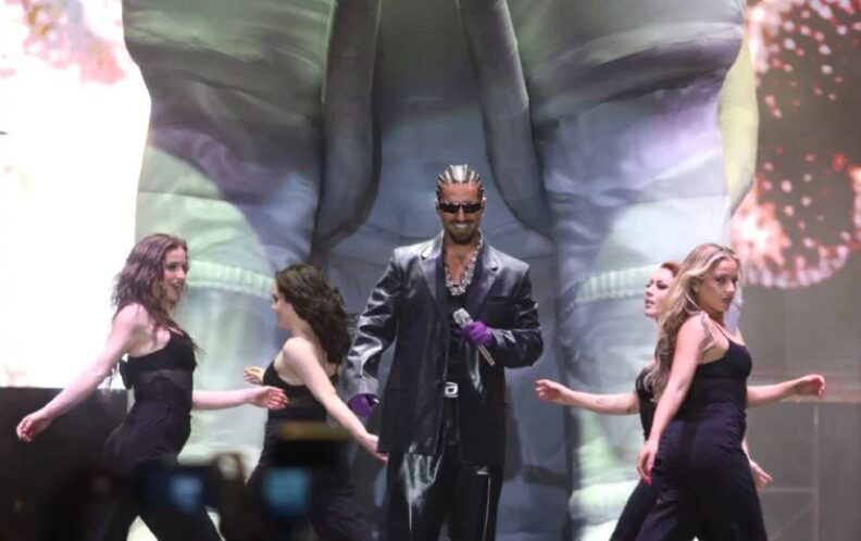 Así fue pasando su repertorio de éxitos como «la vida es un carnaval», y pedía «brincando, brincando», invitando a gozar.
