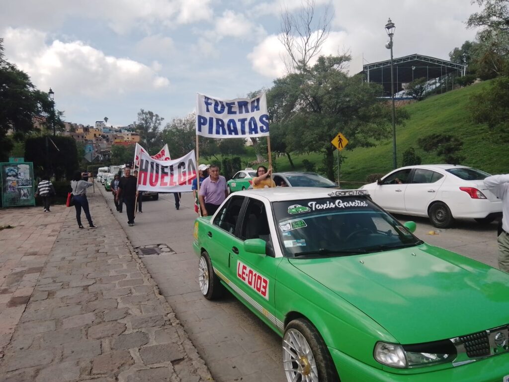 Guanajuato, Gto., (30 de agosto de 2022).- Integrantes de la Federación de Taxistas de Guanajuato se manifestaron por las calles de la ciudad capital para demandar al gobierno del estado actúe contra taxistas que usan “ilegalmente” plataformas o servicio por teléfono, lo que calificaron como “piratas” que hacen competencia desleal.