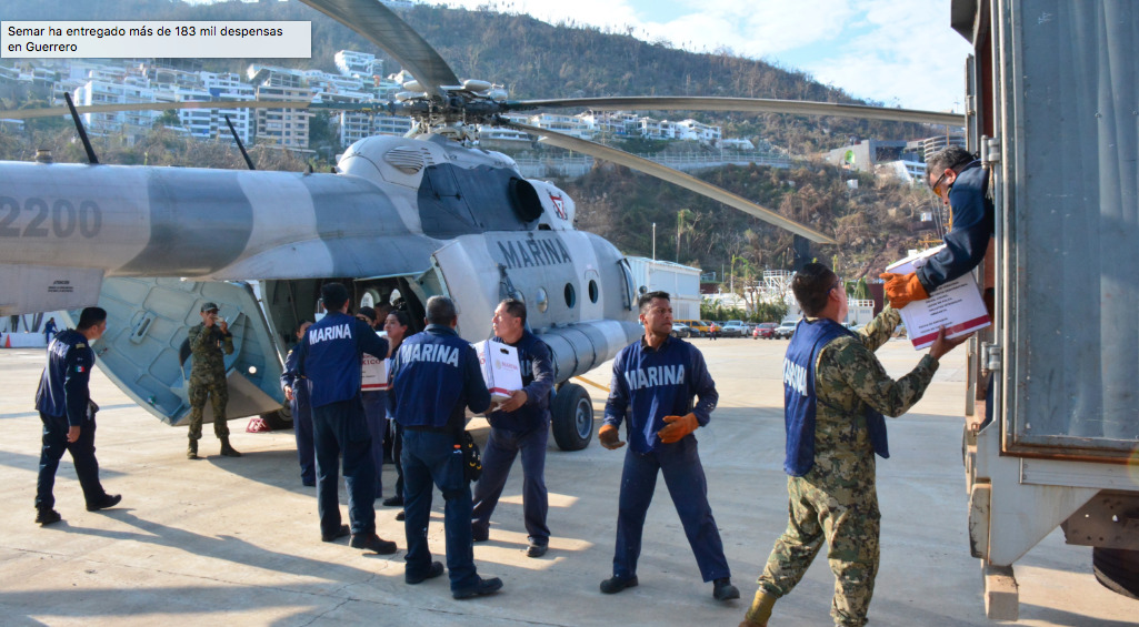 De acuerdo con la dependencia, se han desplegado un total de 8 mil 377 elementos navales en la zona afectada además de que se han instalado siete cocinas móviles y dos tortilladoras en Acapulco, las cuales del 27 de octubre al 12 de noviembre del presente año, han elaborado un total de 60 mil 571 raciones; además, siete plantas potabilizadoras han producido y entregado un millón 26 mil 386 litros de agua a la población.
