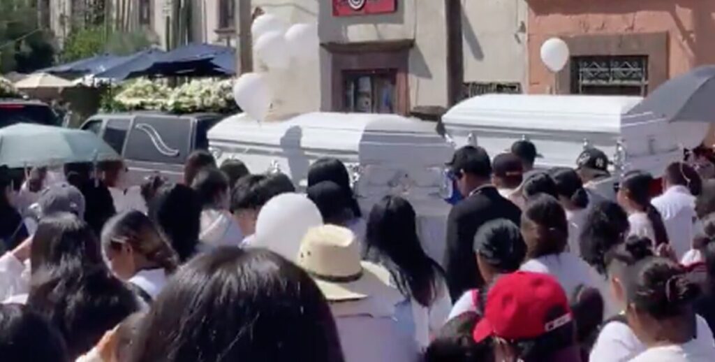 Jóvenes y niños, portando flores y globos blancos, se unieron al cortejo. Mientras caminaban, algunos de ellos cargaban los ataúdes en hombros y, en un emotivo gesto, dedicaron porras, entonaron “Amor Eterno” y lanzaron cohetones en honor a los fallecidos.