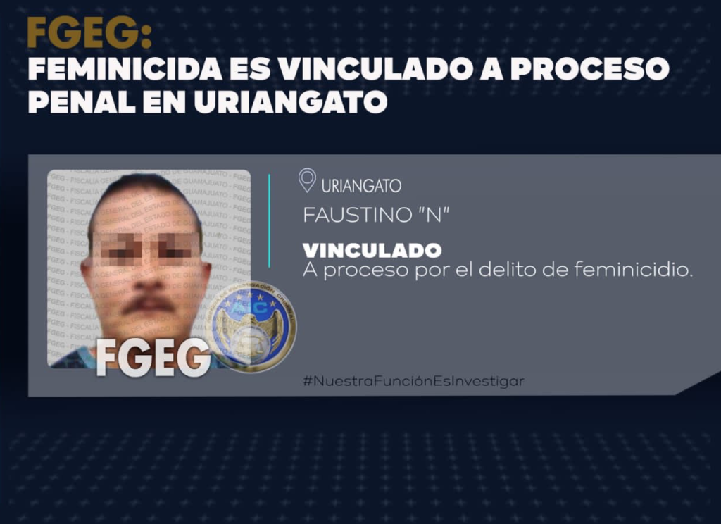 Elementos de la Secretaría de Seguridad Pública dieron aviso al Ministerio Público, sobre una mujer sin vida, quien presentaba huellas de violencia, en un domicilio de la calle Independencia, en la colonia «La Joyita» en el municipio de Uriangato, así como de un sujeto detenido que se encontraba en barandilla, quien se identificó como Faustino «N».