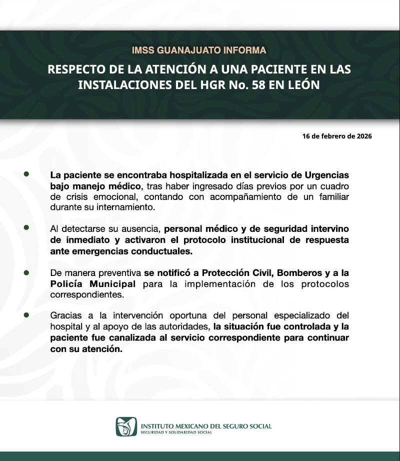 El IMSS Informó que el 16 de febrero de 2026, una mujer se encontraba hospitalizada en el servicio de Urgencias bajo manejo y observación médica, tras haber ingresado días previos debido a un cuadro de crisis emocional diagnosticado por el personal de salud.
