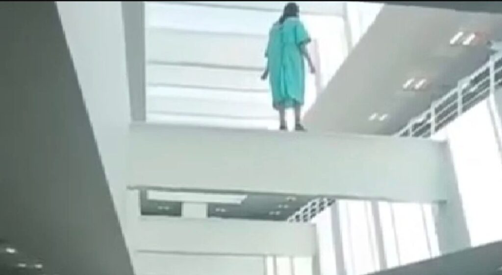 En el video fue captada la mujer, quien llevaba una bata médica azul y logró llegar a una estructura metálica dentro del hospital, a una altura considerable, donde amenazó con lanzarse.