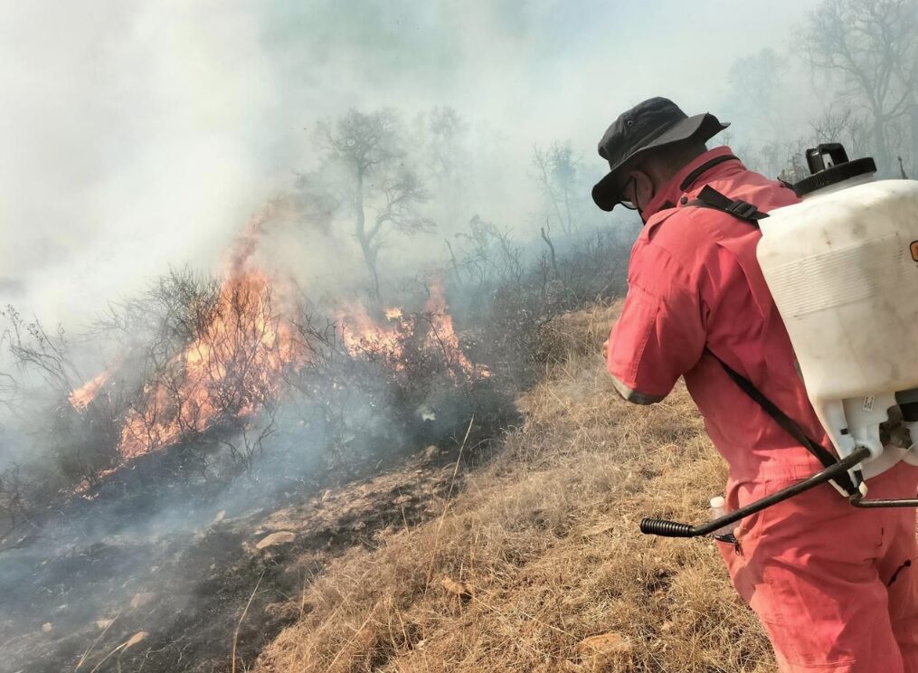 Las brigadas integradas por personal de la Comisión Nacional Forestal, Coordinación Municipal de Protección Civil de Acámbaro y de Protección de Manejo del Fuego de Guanajuato continúan con los trabajos de combate, control y extinción por el lado de la comunidad San Antonio, municipio de Acámbaro.