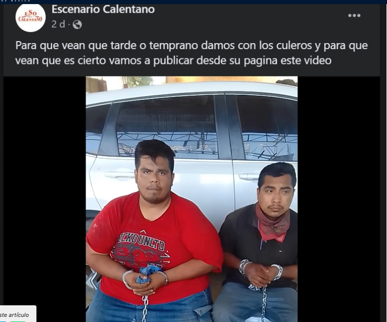 «Nosotros somos parte del equipo de Escenario Calentano, estamos aquí pagando consecuencias de las publicaciones que se realizaban en contra de estas personas, y de diferentes personas de la región de Tierra Caliente del Estado de México, Michoacán y Guerrero”, dice Moreno Villegas mirando hacia la cámara.