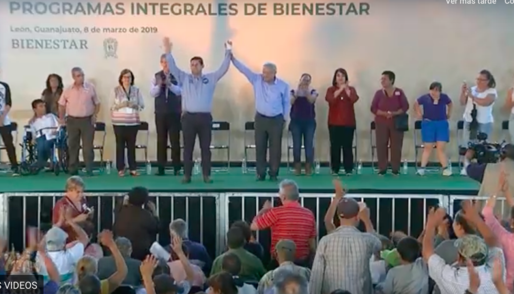 Ante un auditorio a reventar (unos 6 mil asistentes) en la deportiva del Estado en León se llevo a cabo la primera visita del presidente de México, donde presentó los programa sociales de su gobierno, y de manera simbólica hizo la entrega a adultos mayores, jóvenes y personas con discapacidad.