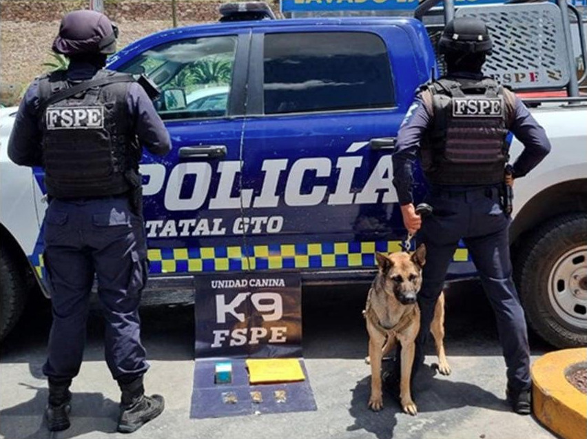Guanajuato, Gto., 22 de julio de 2023.- Como parte de los operativos implementados en empresas de paquetería en esta ciudad, elementos de la Unidad Canina K9 de las Fuerzas de Seguridad Pública del Estado (FSPE), lograron asegurar al interior de una empresa de dicho ramo, 20 dosis de droga con las características de la mariguana.