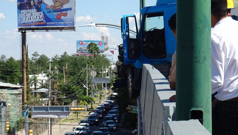 León, Gto. (13 octubre 2023).- Un trailero estuvo a punto de volar en el puente conocido como «La Herradura», en su camino se llevó a dos vehículos.
