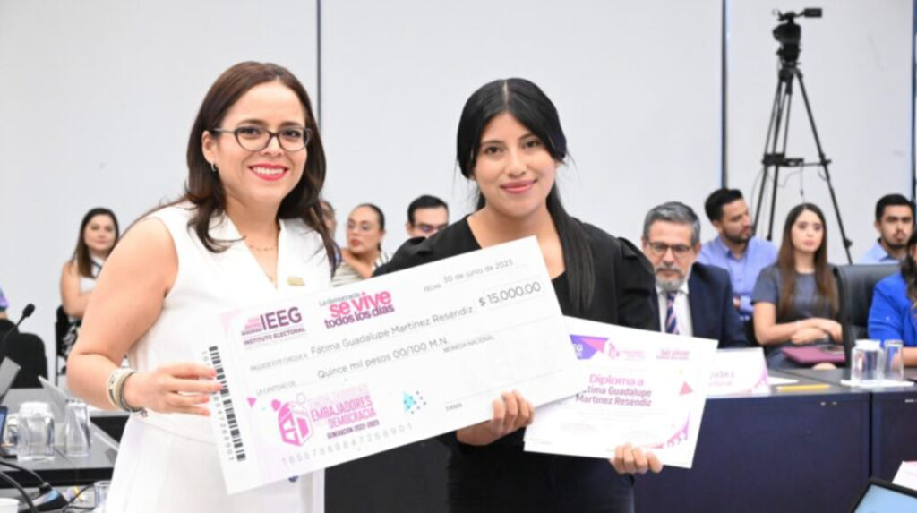 Fátima Guadalupe Martínez Reséndiz, ganadora del programa en su segunda generación y originaria del municipio de Victoria, agradeció al IEEG por la apertura de espacios en los que las juventudes guanajuatenses puedan participar de manera activa; agradecimiento al que se sumaron Vianney González López, quien obtuvo el segundo lugar, así como “MEGAN”, a quien se le otorgó la mención honorífica.