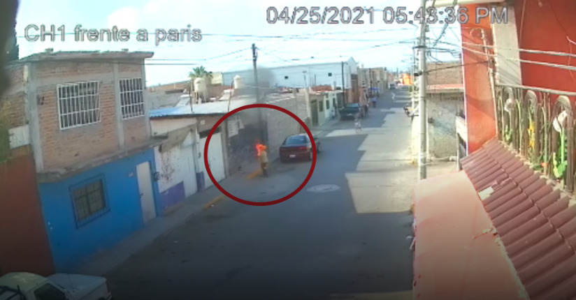 En el video obtenido de una cámara de video-vigilancia la abuelita se observa sentada en una banqueta, cuando se le acerca un hombre joven en bicicleta quien le prende fuego y después huye.