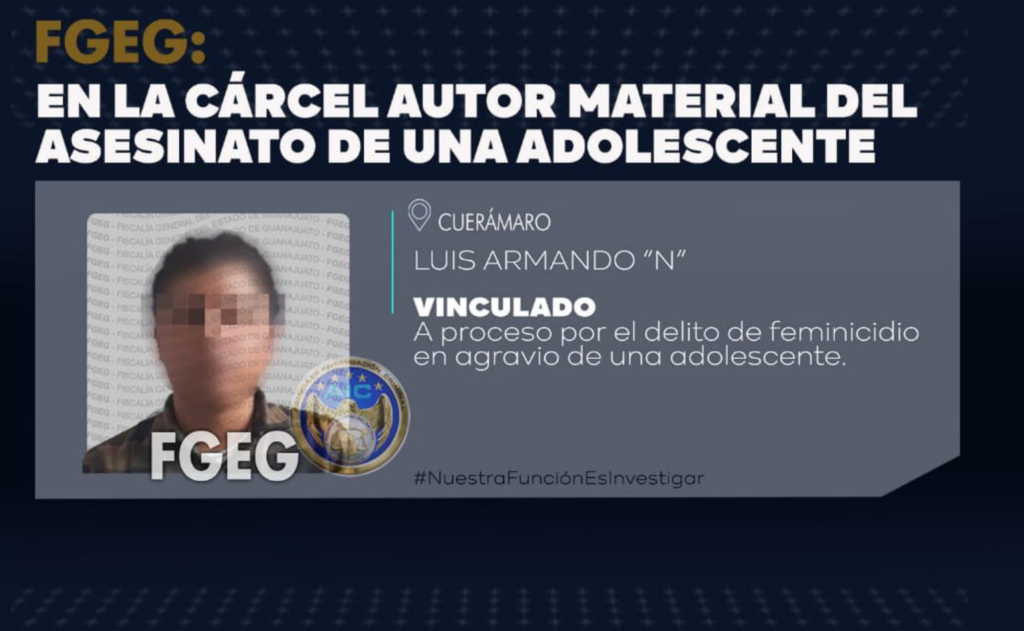 Cuerámaro, GTO 21 Junio 2022.- Una adolescente de 16 años fue asesinada en una vivienda ubicada en la colonia Popular del municipio de Cuerámaro. Las investigaciones permitieron detener al presunto homicida, un joven de 21 años que vivía en unión libre con la menor, ya fue vinculado a proceso por una juez y en prisión preventiva esperará el fallo final por el delito de feminicidio que se le imputa.