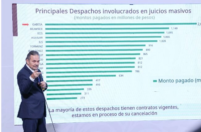 El funcionario denunció que a pesar de que López Obrador ordenó detener los juicios, masivos, una confabulación del poder judicial y de nueve de despachos de abogados continuaron con los juicios en principio individuales pero con la misma estrategia de juicios orales contra 63 mil 44 derechohabientes que fueron denunciadas en la ciudad de México.