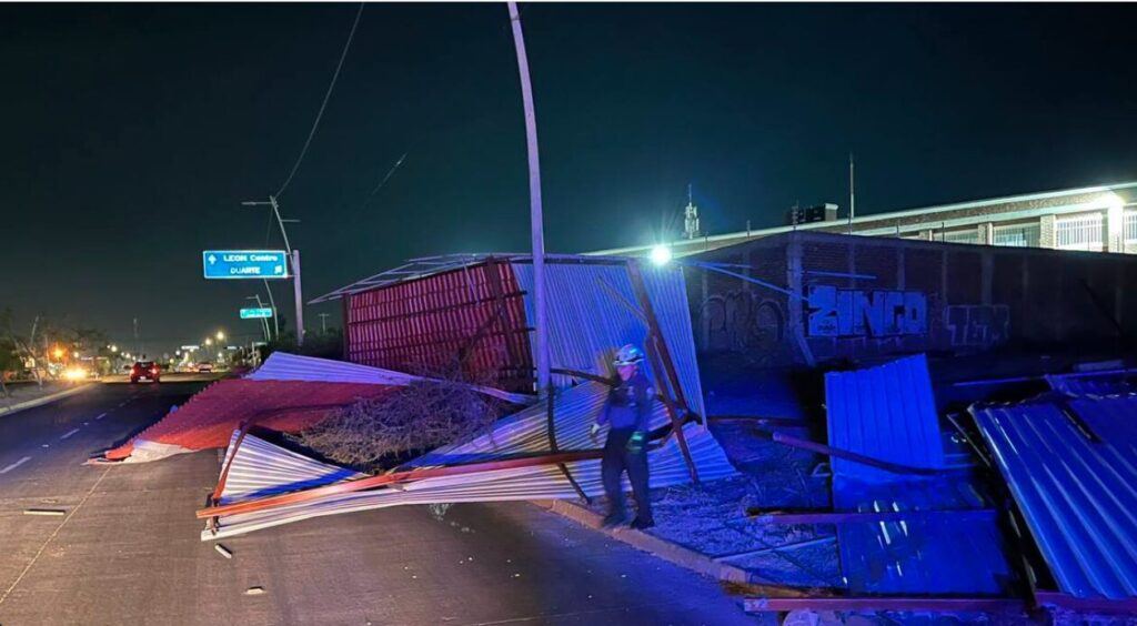 León, Gto. (28 marzo 2026).- Las ráfagas de viento de que se presentaron la tarde y noche de este viernes provocaron caída de árboles, postes y estructuras en la ciudad.