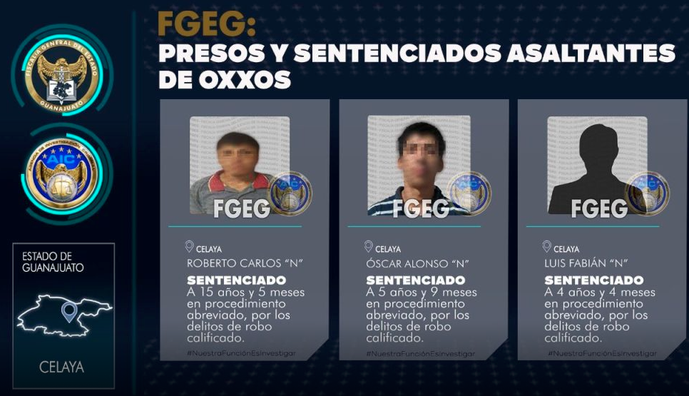 Celaya, Gto. (9 Agosto 2022).- Tras ser encontrados culpables del robo calificado de tiendas Oxxo en más de 20 ocasiones, tres hombres llamados Roberto Carlos, Óscar Alonso y Luis Fabián recibieron sentencia condenatoria de entre 15 y 4 años de cárcel.