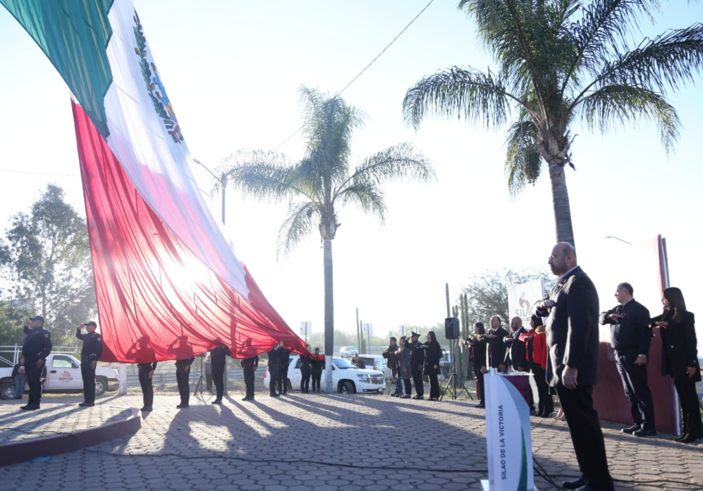 Alumnos de la Telesecundaria 443, así como funcionarios públicos de la administración y un aproximado de 70 elementos de la Secretaría de Seguridad Ciudadana participaron en el Izamiento de Bandera, en la carretera Silao- Guanajuato.