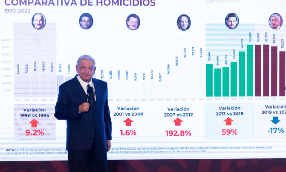 En un análisis del promedio de homicidios dolosos por sexenio desde 1990 a 2023 resalta la disminución de 17 por ciento de variación total en el actual gobierno, a diferencia del aumento de 192.8 por ciento en ese mismo delito que registró el sexenio de Felipe Calderón.