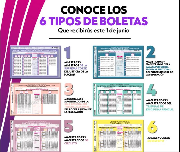 Guanajuato (21 mayo 2025).- El día de la elección 1 de junio los ciudadanos recibirán 6 boletas, una para ministros de la Suprema Corte, una para magistrados del Tribunal de diciplina judicial, una para magistrados de circuito, una para magistrados electorales de la Sala superior de la ciudad de México, otra más para magistrados regionales de la sala Monterrey, y una más para jueces de distrito.