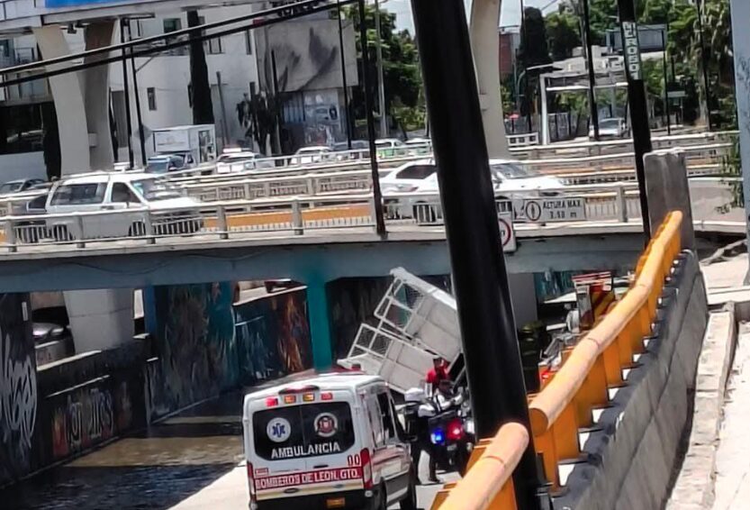 León, Gto. (23 julio 2025).- Pese a la advertencia de evitar pasar si sobre pasa la altura, un conductor de una camioneta se atoró en el desnivel del Malecón del Río.