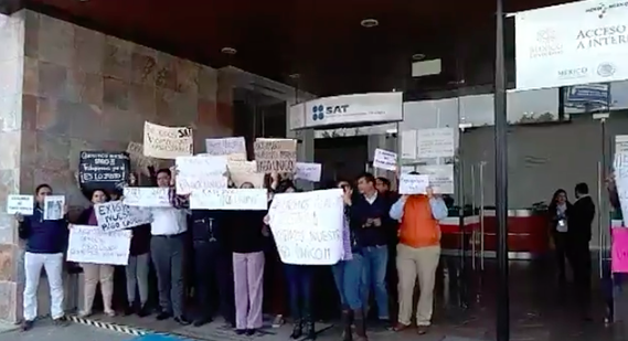 Empleados de la oficia del Servicio de Administración Tributaria (SAT), se manifestaron en las inmediaciones de la dependencia.