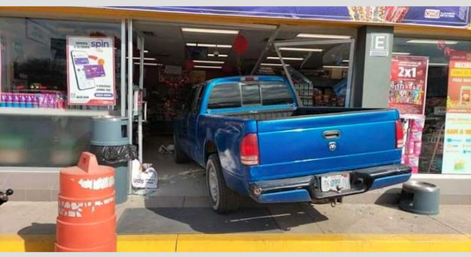 Al parecer, el conductor de la camioneta azul perdió el control cuando se quedó sin frenos al entrar a la gasolinera de la carretera Cuevas y se frenó al chocar contra el Oxxo.