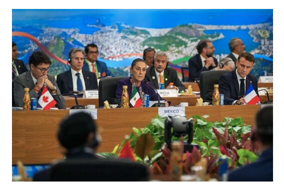 Río de Janeiro (18 de noviembre 2024).– La Presidenta Claudia Sheinbaum participó en la primera sesión de trabajo de la Cumbre de Líderes del G20 titulada “Lucha contra el Hambre y la Pobreza”, en donde propuso sembrar paz y vida, en lugar de guerras, al destinar el 1 por ciento del gasto militar para poner en marcha el programa de reforestación más grande de la historia.