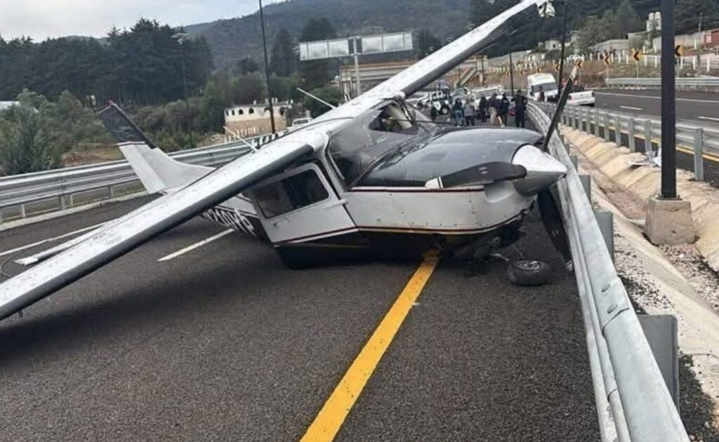 Pachuca, Hidalgo 22 marzo 2025.- Por causas desconocidas, el piloto de una avioneta Cessna estuvo a punto de estrellarse, por lo que se vio obligado a hacer un aterrizaje de emergencia sobre la carretera Real del Monte-Huasca, que será inaugurada el domingo por la presidenta Claudia Sheinbaum Pardo.