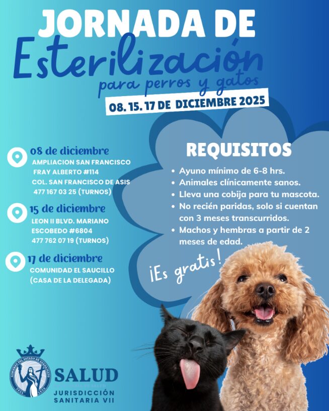 León, Guanajuato.  4 de diciembre de 2025.- La Secretaría de Salud del Estado por medio de la Jurisdicción Sanitaria VII informa una campaña activa de esterilizaciones en el municipio de León.
