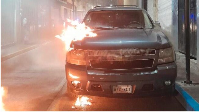 En el lugar encontraron una camioneta suburban, de color azul, con tablillas 672-WCX de la ciudad de México, modelo 2009, perteneciente a la Guardia Nacional que se estaba incendiando.