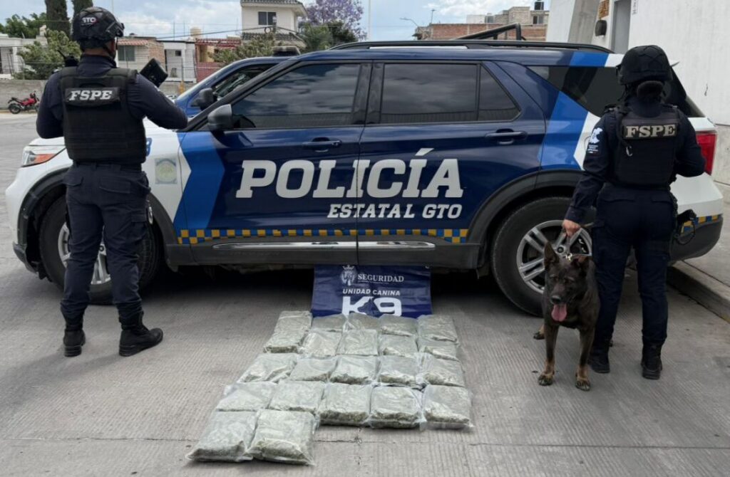 El primer hecho fue en una empresa de paquetería ubicada en la central de autobuses de Irapuato, donde un ejemplar de la Unidad Canina K9 realizó un marcaje positivo sobre un paquete.