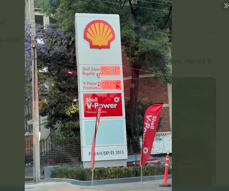 Las fotografías compartidas en redes sociales muestran que el combustible Shell Super Regular (Equivalente a Magna) se vende en 25.19 pesos por litro, mientras que la V-Power Premium cuesta 30.49 pesos.