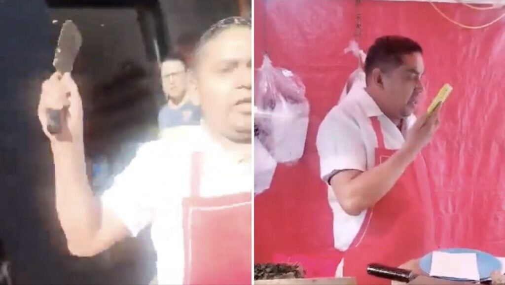 La situación escaló rápidamente y no solo llamó la atención de las autoridades, sino que también capturó la atención de usuarios de redes sociales, quienes difundieron el momento preciso en el que el taquero amenazaba a dos de sus clientes. Según se observa en las imágenes compartidas, el sujeto se comunicaba por teléfono con una persona de identidad no revelada, a quien le pidió acudir al lugar con una pistola, la cual, según sus propias palabras, era usada para secuestrar personas.