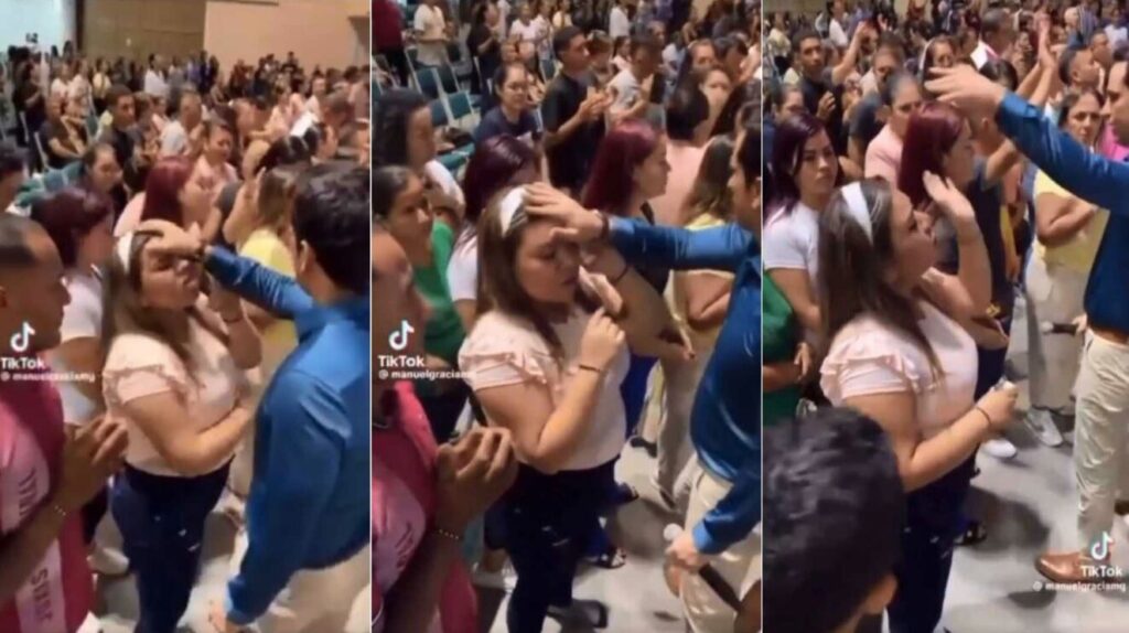 Ante la reacción de la mujer, en lugar de retirarse, el pastor insistió, lo que desencadenó una serie de manotazos por parte de la inconforme. Lo que comenzó como un gesto de bendición se convirtió en un enfrentamiento, con la mujer defendiéndose de los intentos del pastor por imponer sus manos sobre ella.