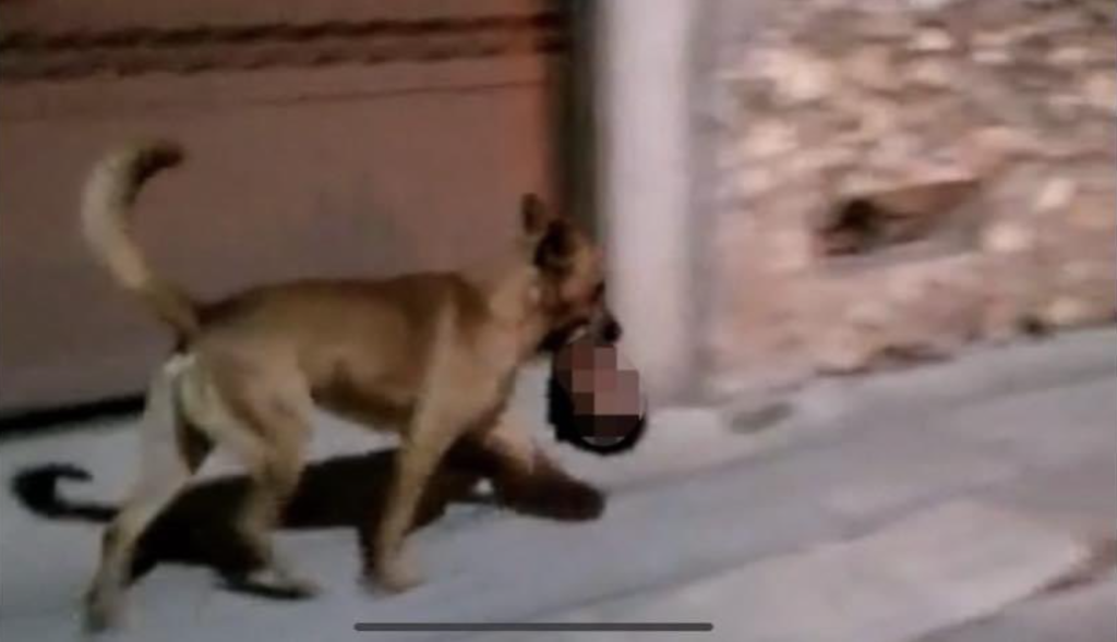 Monte Escobedo, Zacatecas 28 Octubre 2022.- Habitantes de Monte Escobedo quedaron perplejos al ver a un perro corriendo por la calle con una cabeza humana en la boca.