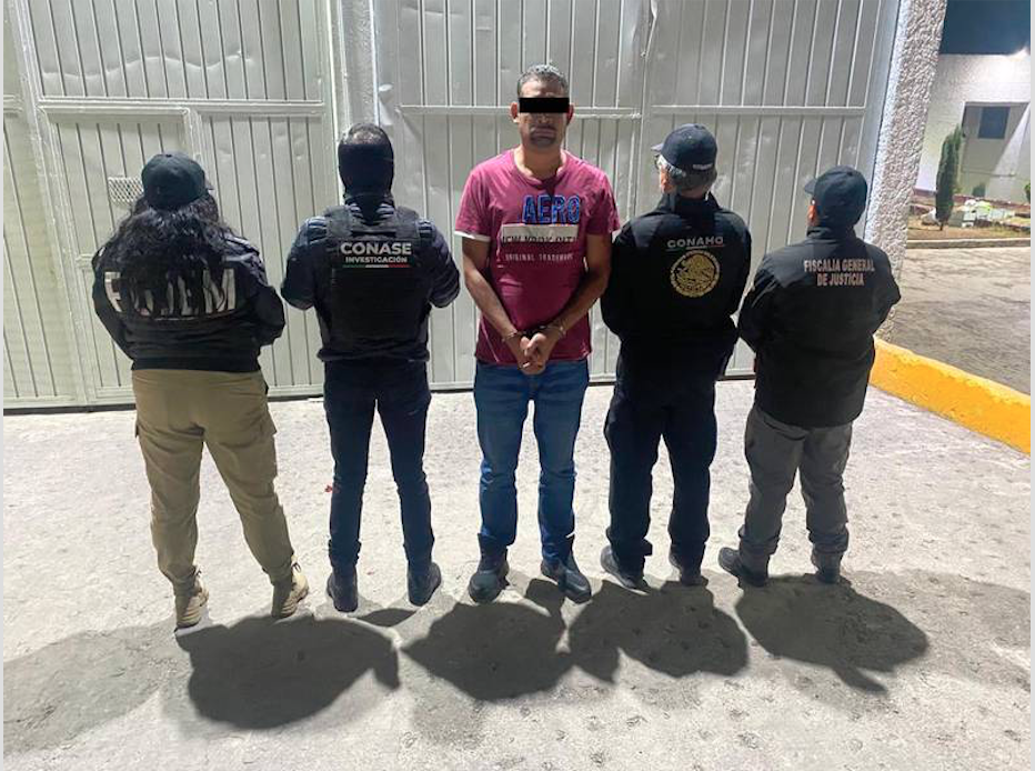 Personal de la FGJEM y la Secretaría de Seguridad y Protección Ciudadana (SSPC), a través de la Coordinación Nacional Antisecuestro (CONASE) y la Comisión para la Atención del Delito de Homicidio Doloso (CONAHO), efectuaron la detención con una orden de aprehensión.